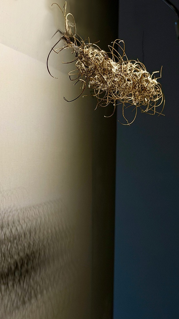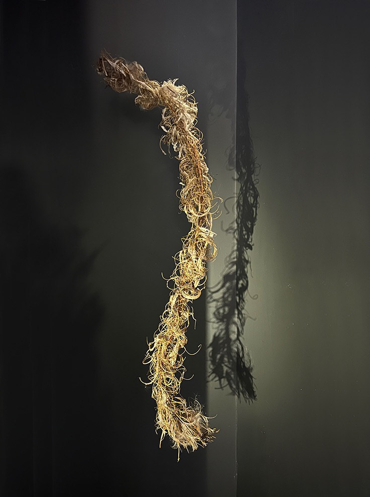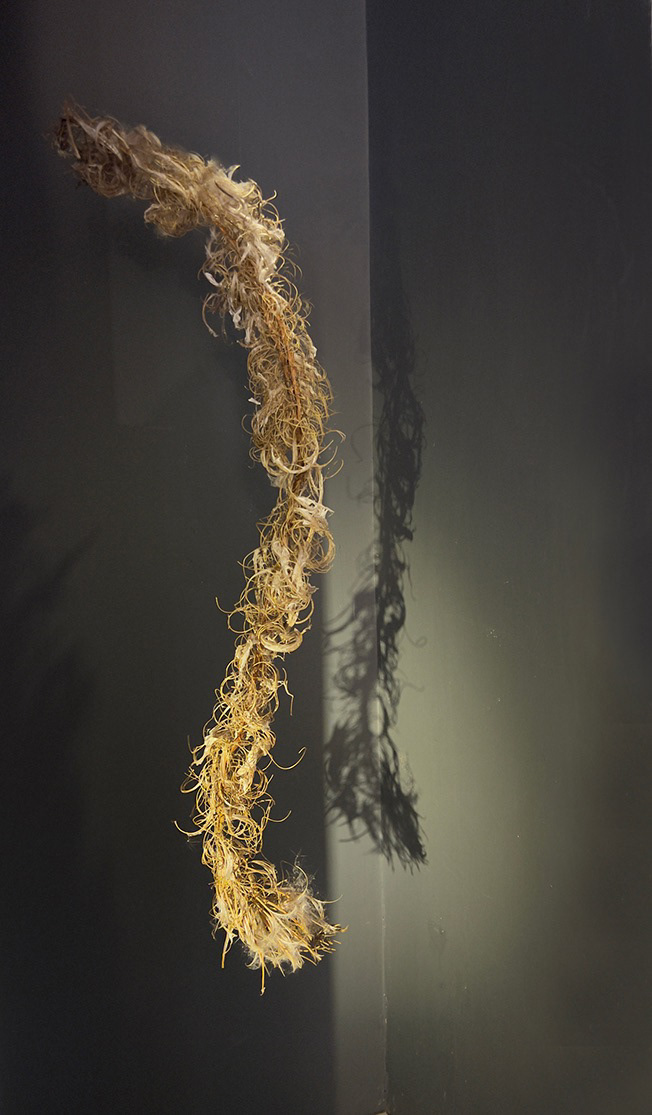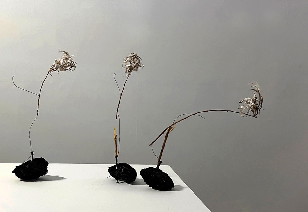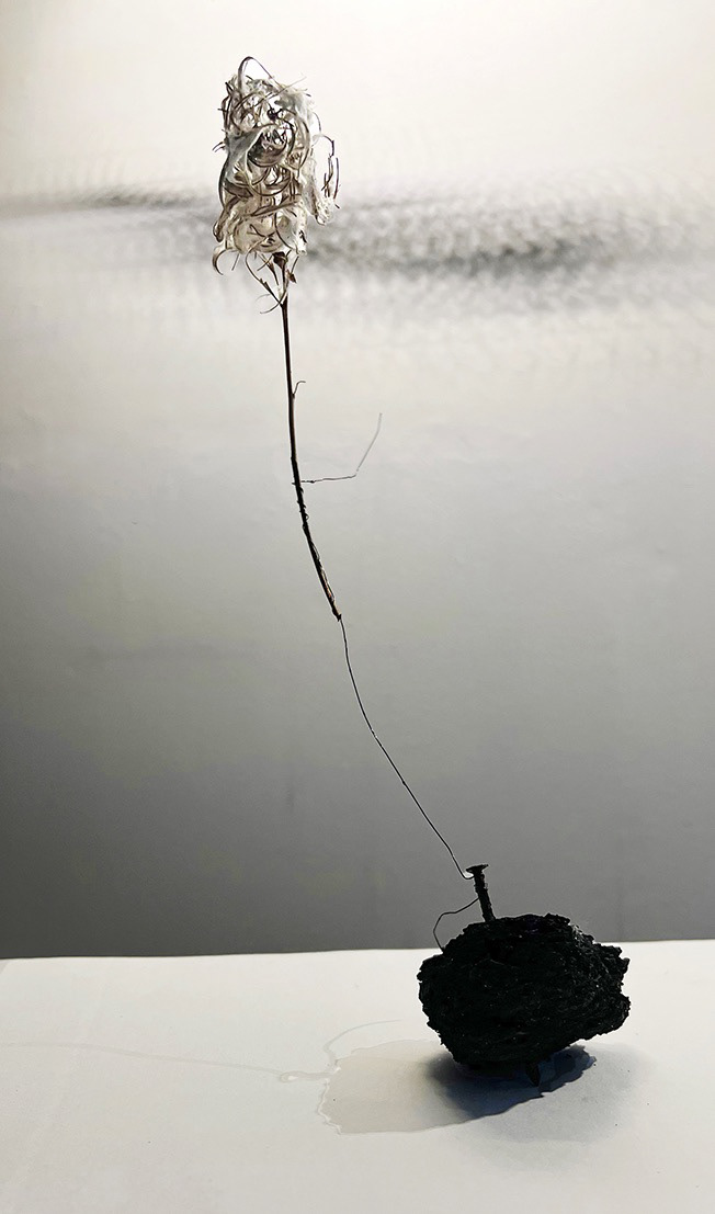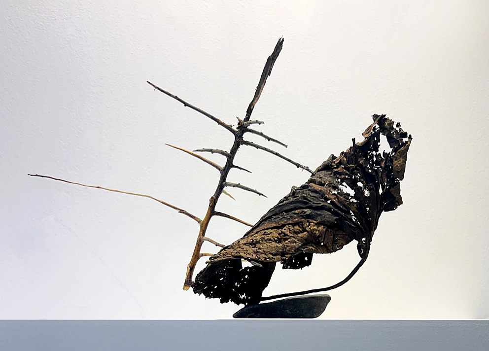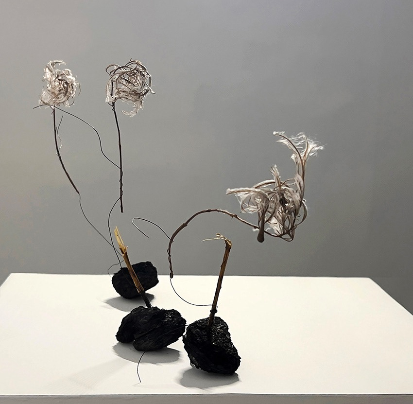 #Chasing the Moon 23 x 58 x 31 CM Rosebay willow herb, ink, found & recycled; knitting wire, burnt wood remains with nails and bitumen.