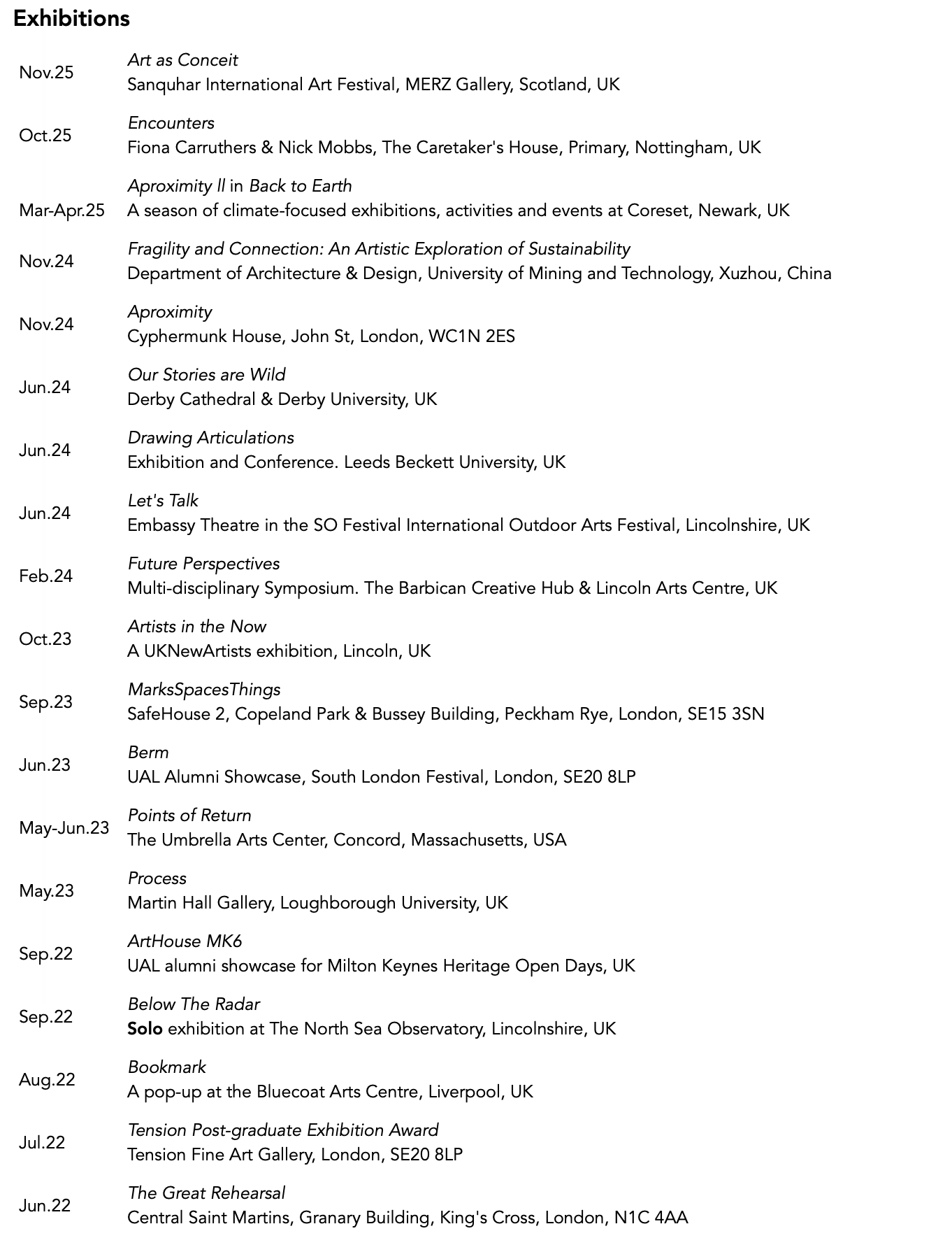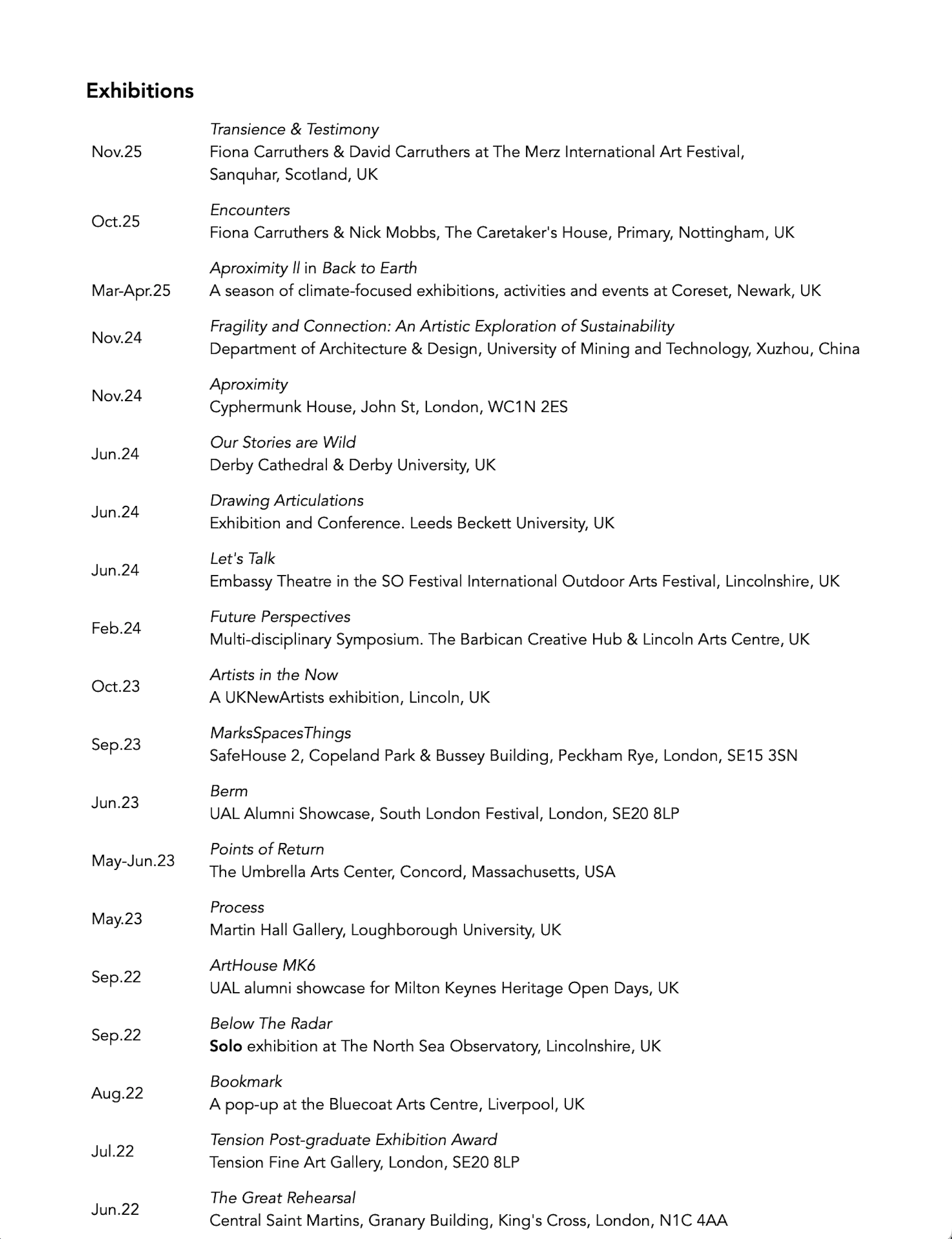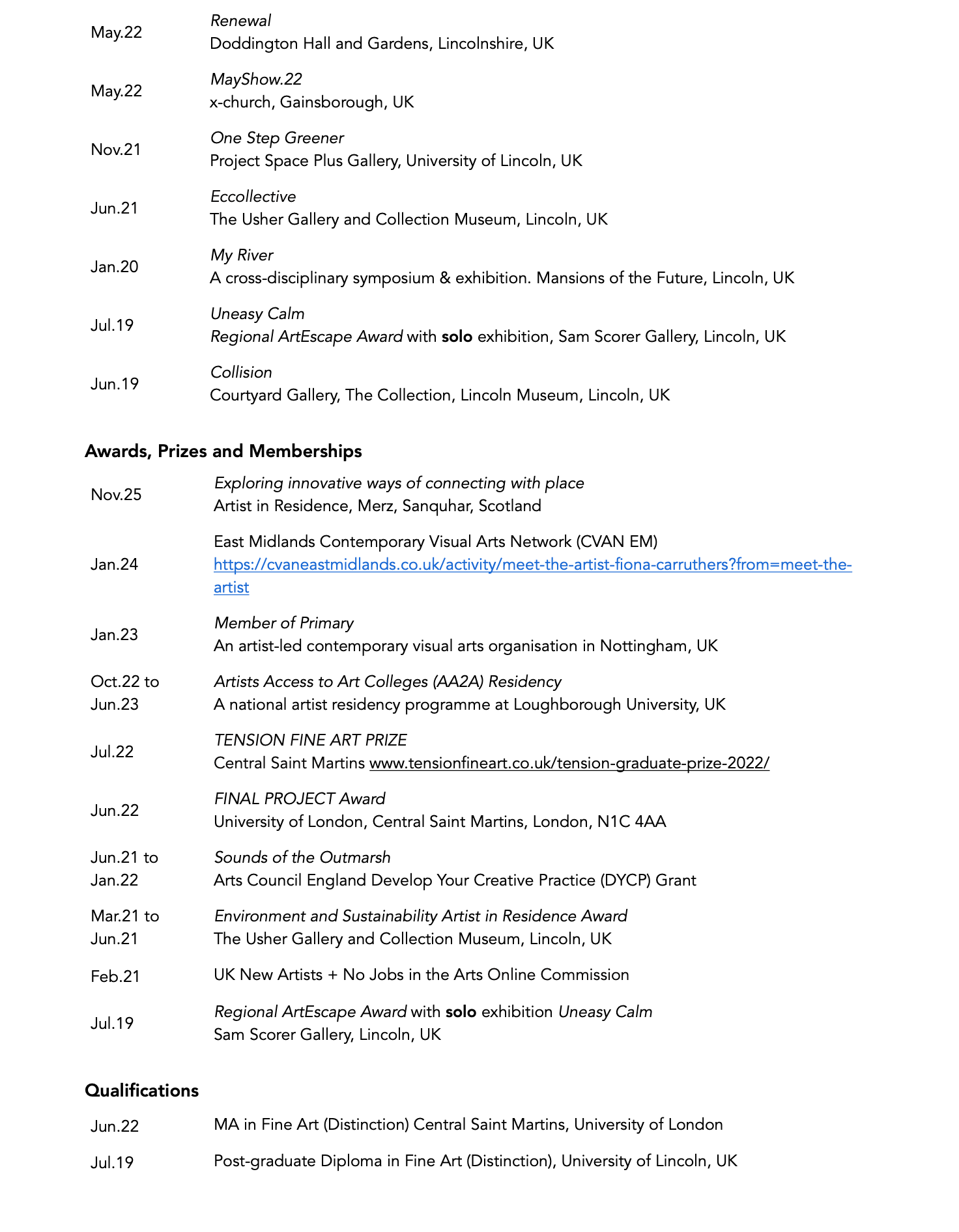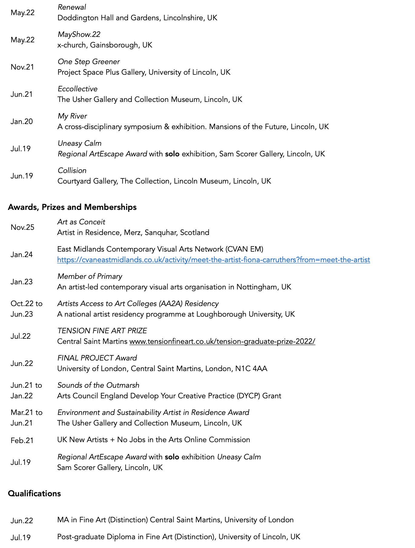 Carruthers exhibits nationally and internationally, holds an MA in Fine Art from Central Saint Martins, and has received awards from Arts Council England, the University of the Arts London and Central Saint Martins. Her works are held in both private collections.